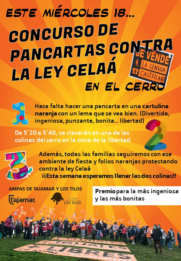 El próximo miércoles 18 de noviembre, os convocamos a movilizarnos a partir de las 17:20 h. en las colinas situadas enfrente de las salidas del colegio de la calle Benjamín Palencia. Esta vez vamos a organizar un CONCURSO DE PANCARTAS. Para ello os pedimos que cada familia traiga una PANCARTA NARANJA, TAMAÑO DIN A3 O CARTULINA, en la que EN LETRA GRANDE pongáis el LEMA que queráis, para expresar vuestro rechazo a esta Ley injusta. Podéis mandar el lema de la pancarta a: [email protected] o [email protected], para que podamos seleccionar a los ganadores. Habrá dulces premios.