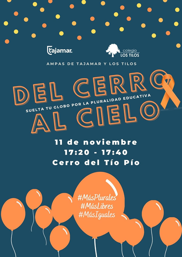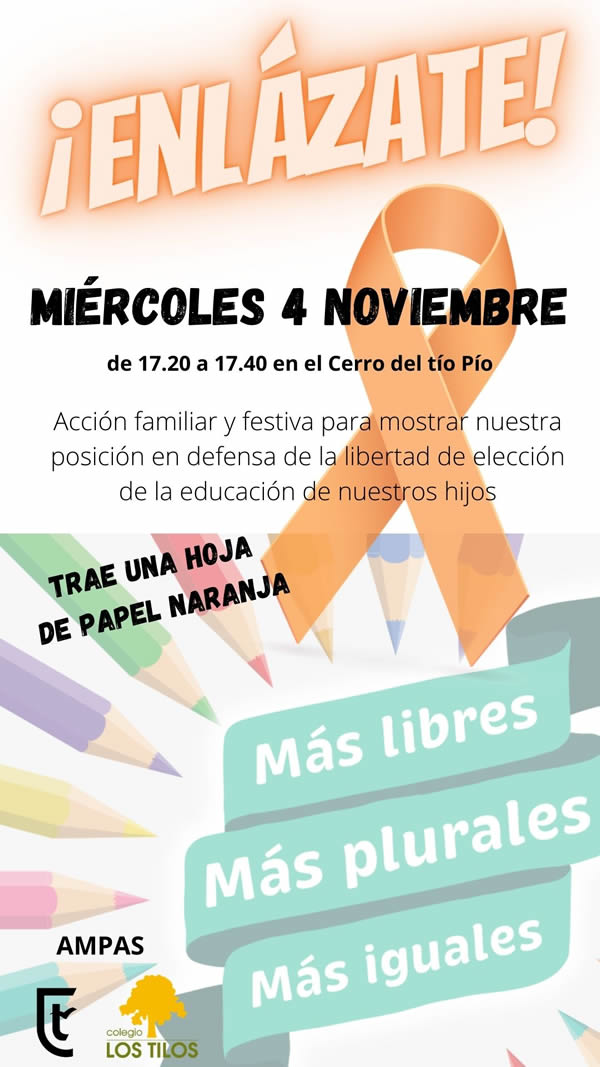 Cada miércoles haremos un acto específico sencillo y a la vez festivo para mostrar el rechazo de las familias. Si el tiempo lo permite, este primer miércoles queremos quedar a la salida de los colegios en el parque de las colinas. Es una oportunidad para asistir familias, alumnos y profesores. Es importante ir con silbatos o algún instrumento que haga ruido y una hoja naranja. La idea es extendernos allí, en torno a un lazo gigante naranja y hacer una gran pitada al proyecto presentado. Tendrá una duración corta, empezando sobre las 17:20 y terminando a las 17:40. Por supuesto, estaremos muy pendientes para que todos cumplamos las medidas de higiene y distancia interpersonal.