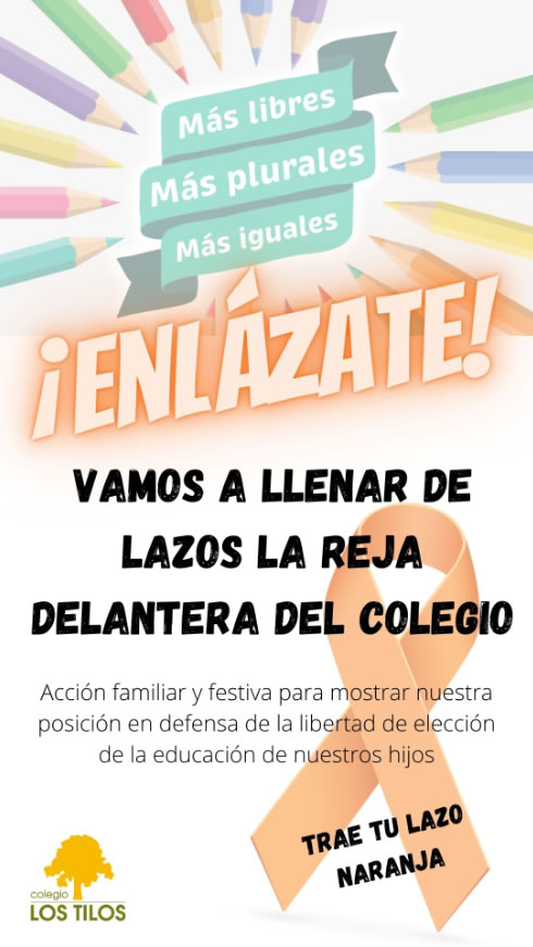 Este jueves empezaremos a llenar la reja delantera del colegio de lazos naranjas, una de las imágenes elegidas para mostrar el rechazo a la ley. Desde el colegio se proporcionarán algunos pero son fáciles de conseguir en cualquier mercería. Durante el tiempo que dure la campaña de protesta seguiremos enlazando la reja hasta llenarla totalmente. De esta forma daremos visibilidad a la defensa de la libertad de elección de la educación de nuestros hijos.