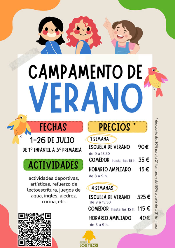 Del 1 al 26 de julio ofrecemos un campamento urbano en el colegio, en el que podrán participar, por semanas, las alumnas desde 1º de Educación Infantil hasta 3º de Primaria inclusive. Realizarán actividades deportivas, artísticas, refuerzo de lectoescritura, juegos de agua, inglés, ajedrez, cocina, etc. Cada alumna traerá una mochila con una botella de agua, desayuno de media mañana, bañador, toalla, chanclas, gorra, crema solar y peine.