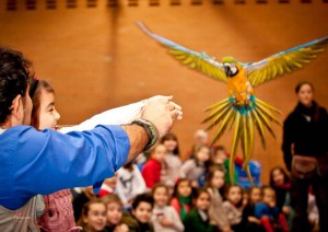 El taller de exhibición de aves ha tenido lugar en dos momentos de la mañana. En el polideportivo hemos podido apreciar el vuelo de lechuzas, cuervos, guacamayos, cotorras y palomas, mientras la monitora experta de Zoo Escuela nos iba describiendo sus características. Otras aves que hemos podido apreciar de cerca eran más conocidas como gallinas y patos.