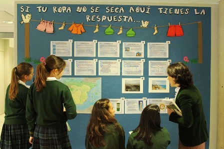 Las alumnas de la ESO han ayudado en la preparación y colocación de los paneles de mayor dimensión como el de la “Historia de la aviación”, el de “¿De dónde viene el viento?”, “Si tu ropa no se seca, aquí tienes la respuesta” o el de “Las capas de la atmósfera”. Además, han ido haciendo turnos para explicar el contenido de los paneles a las alumnas de Primaria.