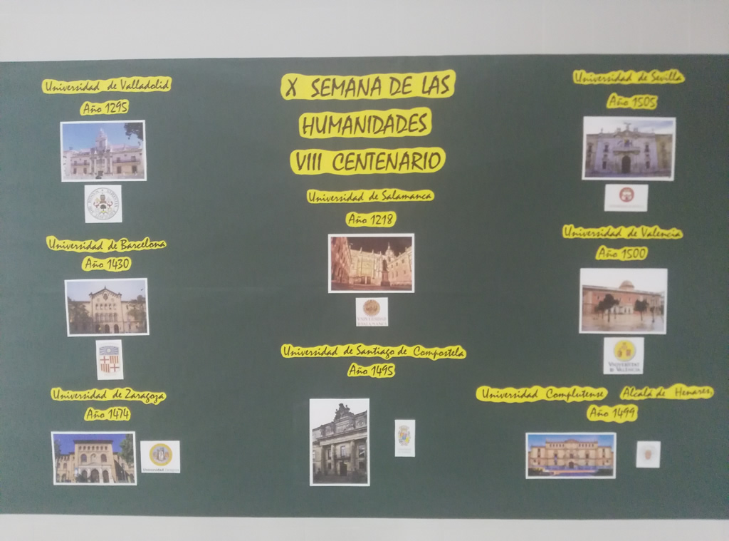 La X Semana de las Humanidades ha querido recordar esta efeméride con un Panel principal en la entrada del colegio en el que se recuerda, además, el año de inicio de otras importantes universidades españolas. Además, la entrada de cada pasillo de Primaria estaba decorado.
